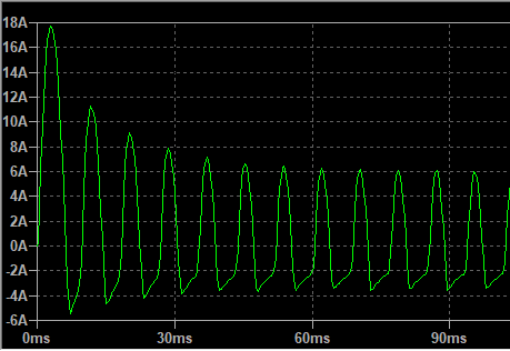 リップル電流を計算で求めるのは簡単ではないので、シュミレーションソフトLTspiceを使用します。R0はトランス巻き線の抵抗を想定しています。コンデンサの内部インピーダンスやトランスの飽和などは無視していますので、あくまで概算です。